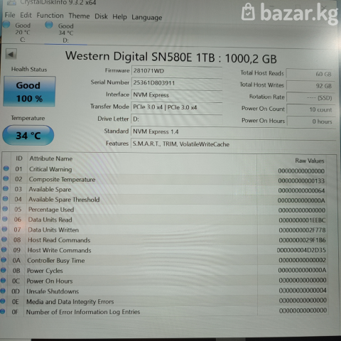Хороший вариант внешнего накопителя для повседневных задач. Western Digital SN580E 1TB + алюминиевый бокс. SSD практически новый, 0 часов работы (смотрите фото), оригинальный, без внешней упаковки. Бокс новый, был открыт только для установки и проверки SSD. Продается только вместе, комплектом (кейс + SSD). Пожалуйста, прочитайте внимательно! Это не магазин. Я - частное лицо. Вещи у меня единичные. Нет гарантии, нет возврата, нет обмена. Времени на проверку не предоставляется. Проверка возможна при самовывозе или до отправки, после полной предоплаты (если доставка). Торг не уместен, все цены окончательные. По вопросам пишите на Ватсапп. Оставляйте именно текстовые сообщения, звонки и голосовые могут быть пропущены. Просьба, пишите с 9:00 до 21:00