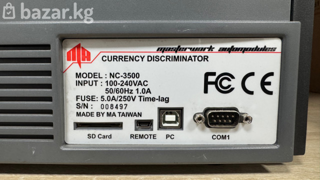 Сортировщик‑счетчик банкнот Masterwork Automodules NC-3500 (Currency Discriminator) - Профессиональный дискриминатор валют с функцией сортировки по номиналу и проверкой подлинности. - Панель управления с дисплеем, кнопками F1–F3 и режимами сортировки/счёта. - Приёмный и выходной карманы с разделителями для раздельного сброса. - Детекция: многозонные датчики (оптические/ИК/магнитные – указывается на серии NC), автоматическое определение номинала. - Питание: 100–240 В AC, 50/60 Гц, 1.0 A. - Предохранитель: 5.0A/250V Time‑lag. - Интерфейсы и слоты: SD Card (обновление ПО/баз валют), порт REMOTE, USB (PC), COM1 (RS‑232). - Сертификаты: FCC, CE. - Модель: NC‑3500 Подходит для банков, кассовых узлов и ритейла: быстро считает смешанные пачки, сортирует по номиналу/ориентации, отбраковывает подозрительные купюры. Компактный корпус, удобный лоток загрузки и кнопка Start на панели.