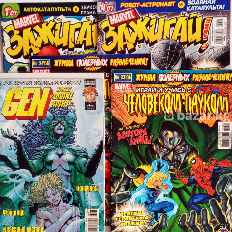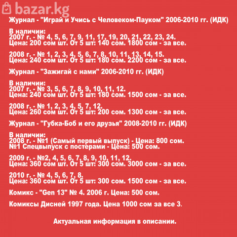 Журнал - "Играй и Учись с Человеком-Пауком" 2006-2010 гг. (ИДК) В наличии: 2007 г. - № 4, 5, 6, 7, 9, 11, 17, 19, 20, 21, 22, 23, 24. Цена: 200 сом шт. От 5 шт: 140 сом. 1800 сом - за все. 2008 г. - № 1, 2, 3, 4, 5, 6, 7, 8, 10, 11, 13, 14, 15. Цена: 240 сом шт. От 5 шт: 180 сом. 2200 сом - за все. Журнал - "Зажигай с нами" 2006-2010 гг. (ИДК) В наличии: 2007 г. - № 3, 5, 6, 7, 8, 9, 10, 11, 12. Цена: 240 сом шт. От 5 шт: 180 сом. 1500 сом - за все. 2008 г. - № 1, 2, 3, 4, 5, 7, 12. Цена: 260 сом шт. От 5 шт: 200 сом. 1300 сом - за все. Журнал - "Губка-Боб и его друзья" 2008-2010 гг. (ИДК) В наличии: 2008 г. - №1 (Самый первый выпуск) - Цена: 1000 сом. №1 Спецвыпуск с постерами - Цена: 500 сом. 2009 г. - №2, 4, 5, 6, 7, 8, 9, 10, 11, 12. Цена: 360 сом шт. От 5 шт: 300 сом. 3000 сом - за все. 2010 г. - № 4, 5, 6, 7, 8. Цена: 360 сом шт. От 5 шт: 300 сом. 1500 сом - за все. Комикс - "Gen 13" № 4. 2006 г. Цена: 500 сом. Комиксы Дисней 1997 года. Цена 1000 сом за все.